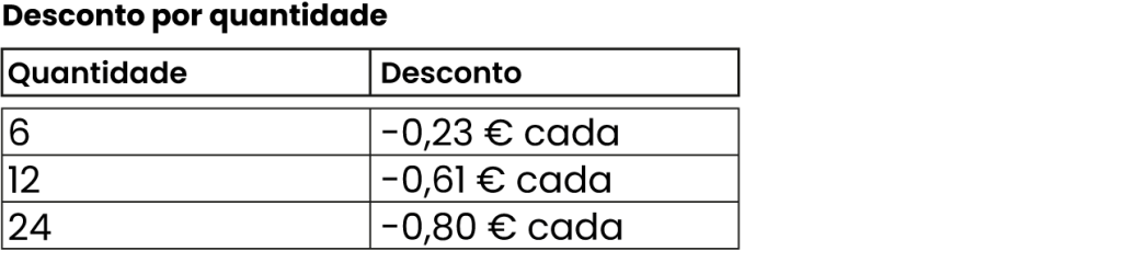 | Quantidade | 1 caixa, 6 caixas, 12 caixas, 24 caixas |