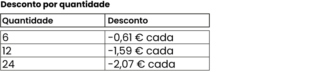 | Quantidade | 1 caixa, 6 caixas, 12 caixas, 24 caixas |